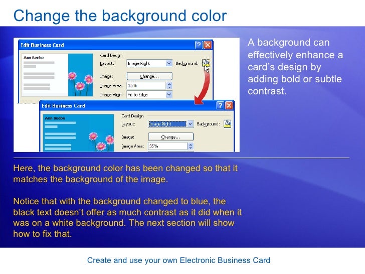 How to Create a Digital Business Card on iPhone and Android Devices (Wayne Park) In some ways, Electronic Business Cards (EBCs, or e-cards) created in Outlook are even better because when you send an EBC to clients, colleagues, and friends. HELP Click on any of the details on the card, to edit them. Make a logo for your professional business card, at no additional cost.